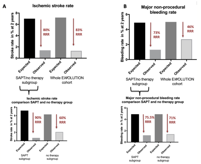 As expected, the lowest bleeding rate at 2 years was observed in patients switched to SAPT/no therapy after 3-6 months, when comparing the different EWOLUTION collectives (Figure 4B). However, overall bleeding rate in EWOLUTION was low and only between 1-5 bleeds/100 PY.