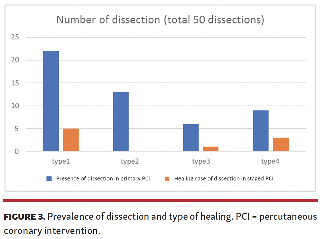 Incidence and evolution of edge dissections. Edge dissections during coronary stenting using angiography have been reported in 1.7%-6.4% of cases,15,16 while the incidence rates have ranged from 5%-23% using intravascular ultrasound.4,17 In a study by Chamie et al,18 a total of 395 stent edges in 230 patients (42 patients with STEMI) were analyzed using OCT and the overall incidence of OCT-detected edge dissections was 37.8%, of which only 16% were detected using angiography. Similarly, Radu et al11 reported 22 dissections in 57 patients using OCT, of which only 2 (9%) were discovered using angiography (STEMI was an exclusion criteria).These differences are related to the resolution of the imaging techniques, as a frame by frame analysis of OCT-based imaging proved to be superior to contrast-based imaging. In the present study, it was demonstrated that 33% had a dissection at 50 stent edges, which was in line with other studies.11,18 We found that 44% of the vessel injuries were type 1 dissection flaps, with 18% of the total dissections healing at 1 week follow-up, and the majority classified as type 4 fissures (38%). Similarly, Radu et al11 showed that 96% of flap dissections healed at 1-year follow-up. Kume et al19 observed that in 36 stable angina patients with 12 edge dissections, all but 1 patient was fully healed at follow-up (median, 188 days). It was concluded that the longer the circumferential extension of the dissection, the greater impediment it posed to vascular healing. Due to the low prevalence, we can only hypothesize that the longitudinal extension/depth of the dissection takes precedence over the maximum length in the healing process, which we can observe in our report as type 4 dissections healed more successfully compared with type 1-3 dissections, which had deeper extensions. In this report, 18% healed within 1 week. This ultra-short follow-up has never been reported for the investigation of early healing of edge dissection in a STEMI population. The absence of clinical events, despite a significant proportion of edge dissections with incomplete healing status at 1 week follow-up, shows that these phenomena are most likely “benign” in the majority of cases and that they resolve at long-term follow-up.