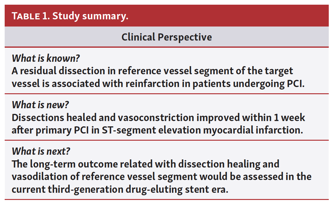 We used OCT to assess the distal and proximal reference segments, adjacent to the culprit lesion, within 1 week after primary PCI in STEMI patients, and found that approximately 1 in 3 patients had residual dissections after stenting, which did not apparently impact on outcomes despite the fact that only 1 in 4 healed shortly after intervention. The lumen area increased overall in the vast majority of patients, especially in the distal reference vessel segment compared with the proximal reference vessel segment, likely reflecting a different vasoconstriction pattern over time.