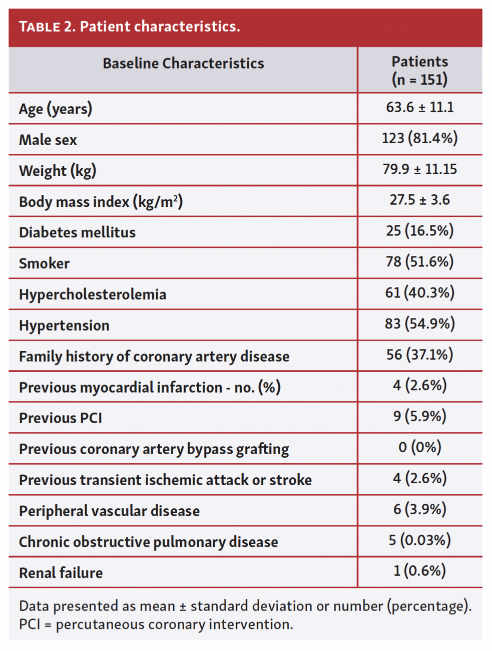 Among a total of 151 patients included in the study, 12 patients were excluded due to poor image quality at the reference vessel segments (Figure 1). The clinical features of the patient population are summarized in Table 2. The mean age was 63.6 ± 11.1 years and 123 patients (81.4%) were men. The left anterior descending coronary artery was involved in 43.8% of the subjects and drug-eluting stents were implanted in the majority of cases (92.8%) (Table 3).