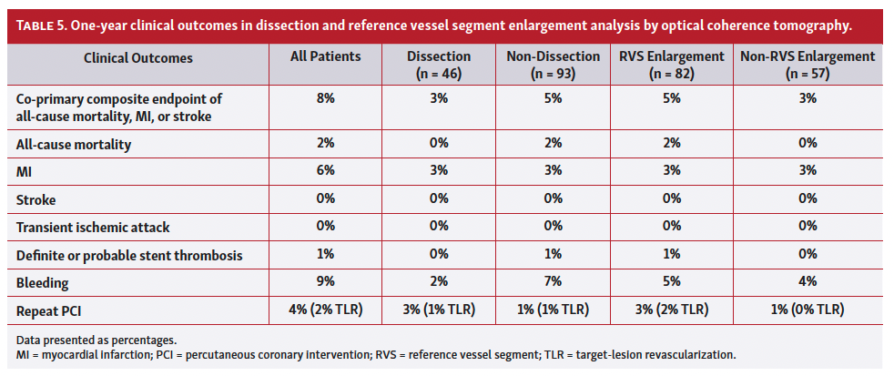 The composite rate of all-cause mortality, myocardial infarction, and stroke at 1 year was 6.1% (n = 8) and was similarly distributed between patients with and without dissection (Table 5).