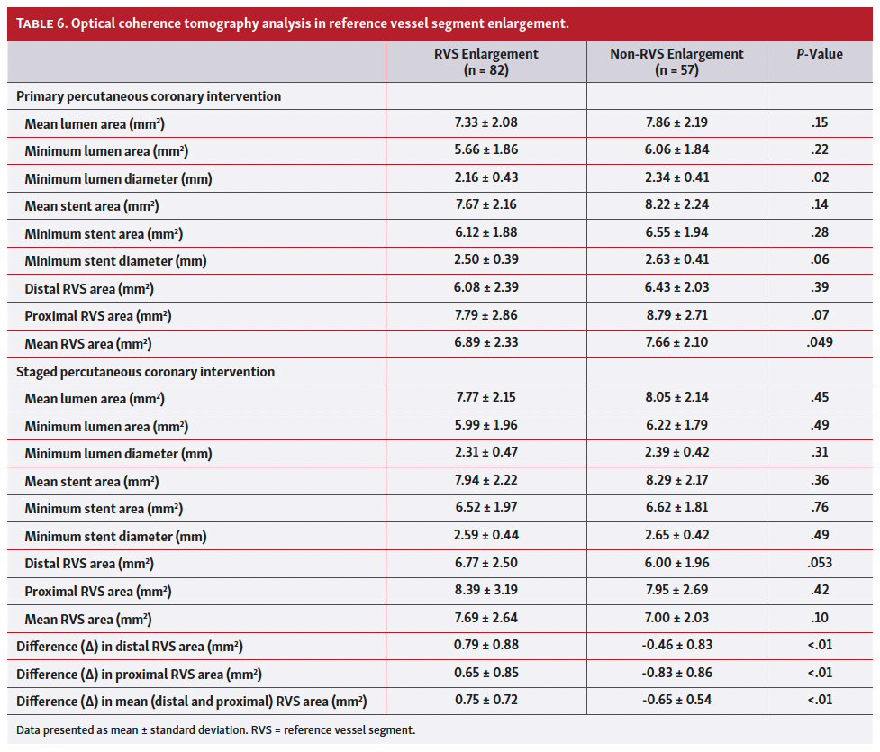 Dynamic coronary luminal changes at reference segments (adjacent to culprit sites). The majority of reference vessel segments (in 82 patients; 59%) increased in lumen dimension within 1 week after primary PCI. At baseline, the mean lumen area was 8.47 ± 2.72 mm2 at the proximal edge and 6.03 ± 0.21 mm2 at the distal edge. There were significant differences in the mean diameter and area changes in the distal vs proximal reference vessel segments (0.06 ± 0.25 mm vs -0.01 ± 0.21 mm, respectively [P=.01] and 0.28 ± 1.06 mm2 vs 0.01 ± 1.13 mm2, respectively [P=.02]) between primary and staged PCI (Table 6). Baseline mean reference vessel segment area was smaller in the reference vessel segment enlargement group than in the non-reference vessel segment enlargement group in primary PCI cases (6.89 ± 2.33 mm2 vs 7.66 ± 2.10 mm2, respectively; P=.049).