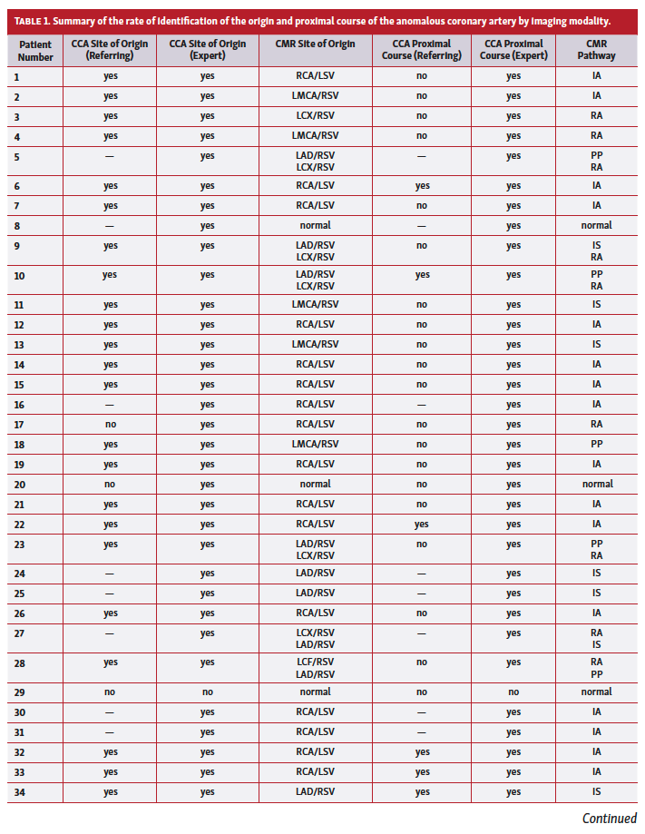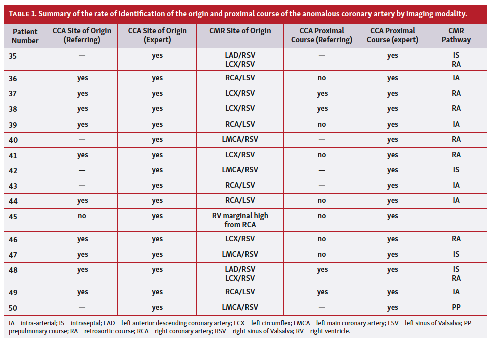 Subjects. Fifty consecutive patients (27 women and 23 men; median age, 56 years) without concomitant congenital heart disease referred to our CMR facility for evaluation of the proximal course of an ACA had CCA images available for our review. Table 1 (Part 1; Part 2) summarizes the rate of identification of the origin and proximal course of the ACA by imaging modality. In 37 of these patients, the original CCA report was available for review. In 48 of the 50 patients, the ACA was identified initially by CCA; in one 13-year-old patient (#22), transthoracic echocardiography suggested an anomalous right coronary artery (RCA) arising from the left sinus of Valsalva (LSV) and passing between the great vessels (following CMR, non-selective aortography demonstrated the ACA). In a 32-year-old patient (#37) with syncope and lateral T-wave inversion on electrocardiogram, the referring cardiologist requested screening CMR out of clinical suspicion of ACA; subsequent CCA was performed at the time of an electrophysiology study.