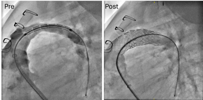 The stent graft is also designed with independent tines rather than a continuous frame, conferring superior flexibility and enabling segmental flaring. This feature is advantageous for trackability over a wire in small pediatric patients, particularly those with branch PA stenosis (Figure 2). In addition, treatment of patients post-LeCompte maneuver may risk the creation of aorto-pulmonary fistula creation, so a covered platform is ideal.6 The flexible frame may allow for a more rounded implant shape contouring to the aorta. The non-contiguous frame also allows for segmental flaring; this creates a funnel into the stent that allows for ease of wire passage and entry upon re-intervention. The additional flexibility of this design leads to improved navigation through the calcified or acutely angulated regions of the RVOT, thereby delaying the necessity for surgical intervention in pediatric cases (Figure 1).
