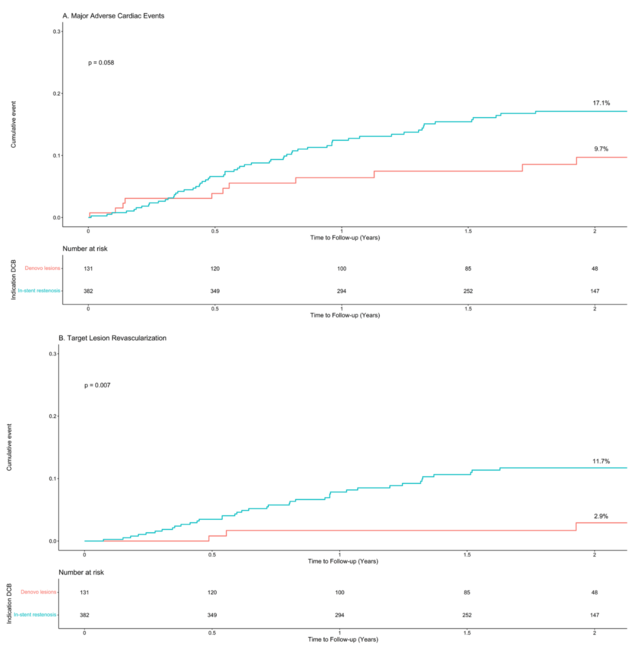 ISR in drug-eluting stents is histologically different from restenosis in bare-metal stents, with different phenotypes of smooth muscle cells proliferating at a low rate.6 On the basis of randomized trial data published in a large meta-analysis, DCBs are similarly effective as drug-eluting stents in the reduction of revascularization for bare-metal stent ISR, whereas they have somewhat lower efficacy in drug-eluting stent ISR.7 The reported incidence of target-lesion revascularization after DCB angioplasty for drug-eluting stent ISR was approximately 15% at 2 years of follow-up.7 Interestingly, in our study, DCB angioplasty was also mainly performed for drug-eluting stent ISR and the incidence of target-lesion revascularization still seems to be slightly lower (11.7%). This observation is even more intriguing given the fact that our data reflect everyday clinical practice, and not a carefully selected randomized controlled trial population. The latter is usually associated with lower event rates.