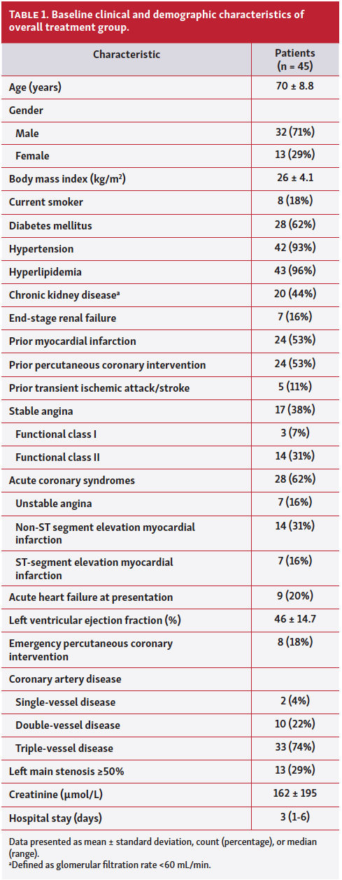 Baseline clinical and procedural characteristics. Between August 2019 and December 2019, a total of 45 patients with 50 calcified lesions were treated with IVL. The baseline characteristics of the overall treatment cohort are shown in Table 1. Mean age was 70 ± 8.8 years, with a high prevalence of male sex (71%) and cardiac risk factors. Prevalence of renal insufficiency was 44%, with 7 patients (16%) in end-stage renal failure. The majority (43 patients) had complex multivessel disease in the form of double-vessel involvement in 22%, triple-vessel involvement in 74%, and left main coronary artery involvement in 29%. Median hospital stay was 3 days (range, 1-6 days). PCI procedural characteristics are shown in Table 2.