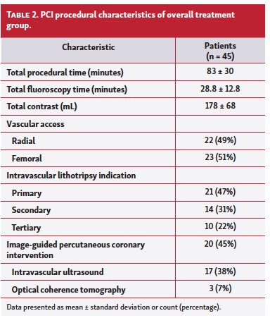 Coronary lesion characteristics. Out of 50 coronary lesions, the target artery was the left main coronary artery in 16%, left anterior descending coronary artery in 44%, left circumflex coronary artery in 16%, and right coronary artery in 24%. The majority of lesions were proximally located (82%) and severely calcified (76%), with mean length of 28.5 ± 12.5 mm. Concentric calcium and eccentric calcium were present in 76% and 24% of lesions, respectively (Table 3).
