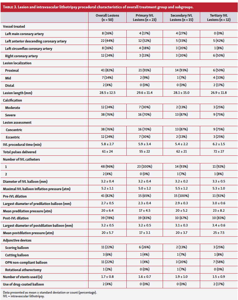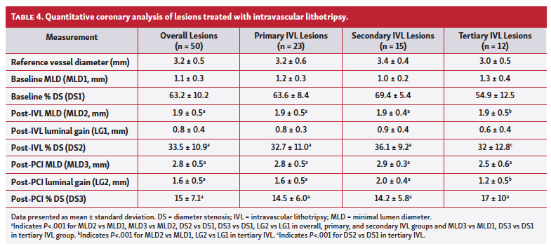 Subgroup analysis. In the primary IVL subgroup, the average diameter stenosis reduced from 63.6 ± 8.4% at baseline to 14.5 ± 6% post PCI (P<.001), with final acute luminal gain of 1.6 ± 0.5 mm. Clinical success was achieved in all 23 lesions (100%) and 1 patient had coronary perforation. In the secondary IVL subgroup, mean diameter stenosis reduced from 69.4 ± 5.4% at baseline to 14.2 ± 5.8% post PCI (P<.001), with final acute luminal gain of 2 ± 0.4 mm. Clinical success was achieved in 13 of 15 lesions (87%). In the tertiary IVL subgroup, mean diameter stenosis reduced from 54.9 ± 12.5% at baseline to 17 ± 10% post PCI (P<.001), with final acute luminal gain of 1.2 ± 0.5 mm. Clinical success was achieved in 9 of 12 lesions (75%); 2 lesions did not achieve final residual diameter stenosis <30% and 1 lesion was in a patient who had periprocedural MI that was medically treated (Tables 4 and 5).
