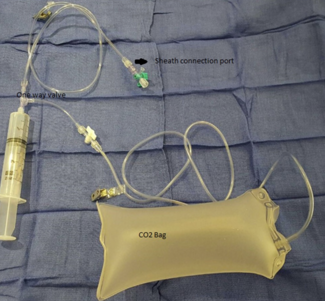Our invasive evaluation protocol is as follows: CO2 is insufflated into the dedicated bag of the flush kit with a 3-way on stopcock (ICU Medical) using precautions to prevent any contamination with room air. This is achieved by deflating the bag entirely after each cycle of insufflation with CO2 and repeating this cycle of insufflation and deflation 4 times before locking the CO2 in the dedicated bag after the fifth insufflation. Once the CO2 injection system (Figure 1) is ready, arterial access using a micropuncture (Cook) technique is obtained in the ipsilateral (to the transplanted site) femoral artery, making certain that the wire does not access the renal vasculature. An 11 cm-long, 6 Fr sheath is placed in the common femoral artery. A 30 mL syringe is used for injecting CO2 into the side port of the arterial sheath. Beginning with a shallow right anterior oblique projection, several pictures are recorded on a dedicated protocol of DSA for CO2 in varying projections until the potential stenotic lesion is profiled correctly. On average, it takes 5-8 pictures to find the best projection. An ~90° lateral projection is not an uncommon view, given the anterior anastomosis of the renal artery onto the external iliac artery. A final image using a diluted contrast medium is generally recorded for added quality of imaging. Of note, specific attention is paid to diagnose any arteriovenous fistula in the renal vasculature. Given the frequent biopsies that these patients undergo following their transplantation, it is not uncommon to find an iatrogenic fistula as the cause of their hypertension.