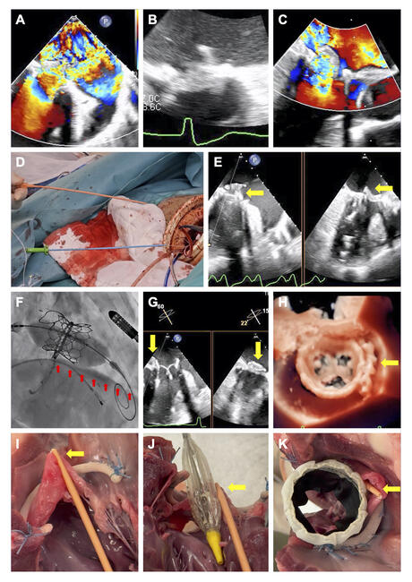 A 69-year-old man had previously undergone mitral valve repair in 2008 with a 30-mm Carpentier-Edwards Physio II annuloplasty ring (Edwards Lifesciences) and a GORE-TEX artificial chordae (Gore Medical) to the AMVL in 2008. Sixteen years after the procedure, he developed severe mitral regurgitation (MR) with ruptured artificial chordae, flail AMVL, and restrictive posterior mitral valve leaflet (Figure A). His left ventricular ejection fraction was preserved. He had a high risk of LVOT obstruction from a long AMVL (37.1 mm). The consensus of the heart team was to attempt repair using the NeoChord DS1000 device (NeoChord, Inc.); if results were unsatisfactory, it was decided to perform TMVR with the UNIFOLD technique.
