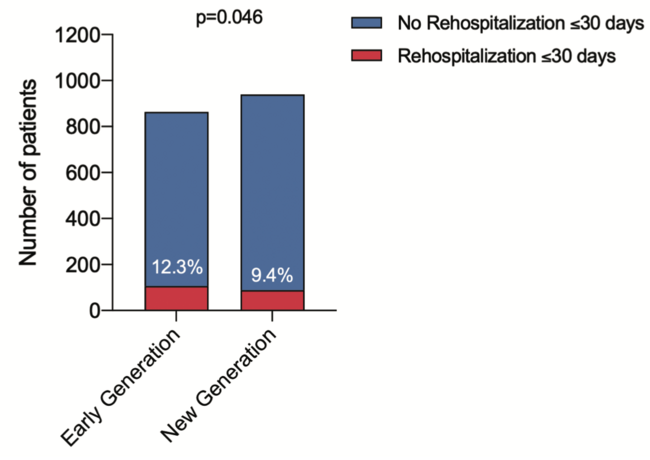 A total of 782 late readmissions (at 31-365 days) were recorded. The proportion of cardiac readmissions (36.8% EGD vs 38.5% NGD; P=.63) as well as in-hospital death at readmission (9.3% EGD vs 9.4% NGD; P=.94) were similar in the two groups. A comparison of causes of late hospital readmission according to device generation is presented in Table 4. At a patient level, 635 patients (35.2%) were hospitalized at least 1 time within the year post TAVR, with a median time to rehospitalization of 110 days (IQR, 37 to 217) post discharge. Multiple readmissions occurred in 232 patients (7.2% EGD vs 5.7% NGD; P<.01), ranging from 2 to 7 hospitalization events. Globally, the rate of unplanned hospital readmission was significantly lower in the NGD population (P<.01). The risk of non-cardiac rehospitalization was also lower in the NGD population (P=.01), while a trend toward a lower risk of cardiac readmission was observed (P=.06) (Figure 2). Rates of hospital readmission related to heart failure (20.0% EGD vs 21.6% NGD; P=.81) and cardiac arrhythmia (7.1% EGD vs 8.3% NGD; P=.54) did not significantly differ between the 2 groups.
