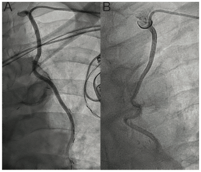 To date, there has been only 1 randomized controlled trial comparing radial and femoral approaches in bypass angiography.8 This trial, RADIAL-CABG, found that radial access for diagnostic bypass angiography was associated with increased contrast volume, increased fluoroscopy and procedure times, increased radiation exposure, and a high cross-over rate, but on the other hand, higher patient satisfaction.9 However, other observational studies have found that the radial approach is associated with similar procedural time, fluoroscopy time, success rate, and contrast volume, and significantly lower rate of access-site complications as compared with the femoral approach.8 As we identify and utilize radial-specific catheters and develop increasing operator experience, it is possible that radial access may reduce adverse events related to diagnostic angiography. This also highlights the need for more randomized controlled trials assessing the safety and efficacy of these 2 approaches for bypass angiography and intervention in the current era.