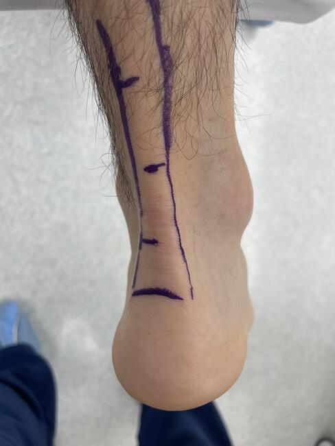 We perform ATL with wounds kept covered in the stockinette prior to the TMA. We create triple transverse hemisections with a 15-blade, spaced 2.5 cm apart (Figure 2). The ankle is passively dorsiflexed until a release is felt, and further fibers can be released if needed. We prefer to slightly overcorrect and obtain close to 10 degrees of passive ankle dorsiflexion. Adherence with postoperative protocol is critical. We have seen overlengthening when patients weight-bear in their splint or walk short distances without their controlled ankle motion (CAM) boot. Both of these problems have been successfully treated with increased duration of immobilization if caught early. Patient education is key to avoid complications.