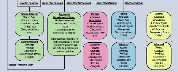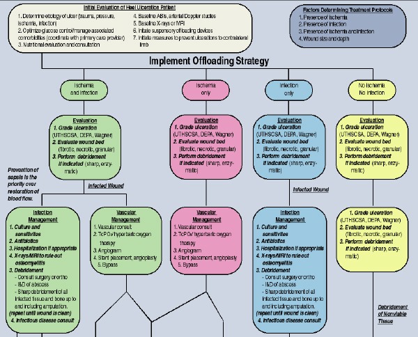One must closely evaluate several critical factors prior to implementing treatment for the diabetic heel ulcer. Accordingly, one should evaluate the depth of the wound and check for the presence of infection, ischemia or the presence of both. The depth of the wound in the face of infection or ischemia ultimately determines prognosis and treatment. Although the Depth Extent Phase and Associated Etiology score is a helpful tool to grade and classify heel ulcers, we prefer the University of Texas Foot Risk and Wound Classification System for these wounds because of the system’s simplicity and its ease in determining prognosis.8 Our proposed algorithm (see below) attempts to illustrate the importance of coalescing multiple factors in order to plan a logical and concise line of treatment. No matter what classification system one uses, remaining consistent with the wound grading process is important in order to accurately predict outcomes and progress. Appropriate evaluation of the wound site should include a thorough description of the wound bed and the surrounding tissues. In order to provide appropriate treatment for the specific state of the wound, it is important to recognize all wounds are evolving.