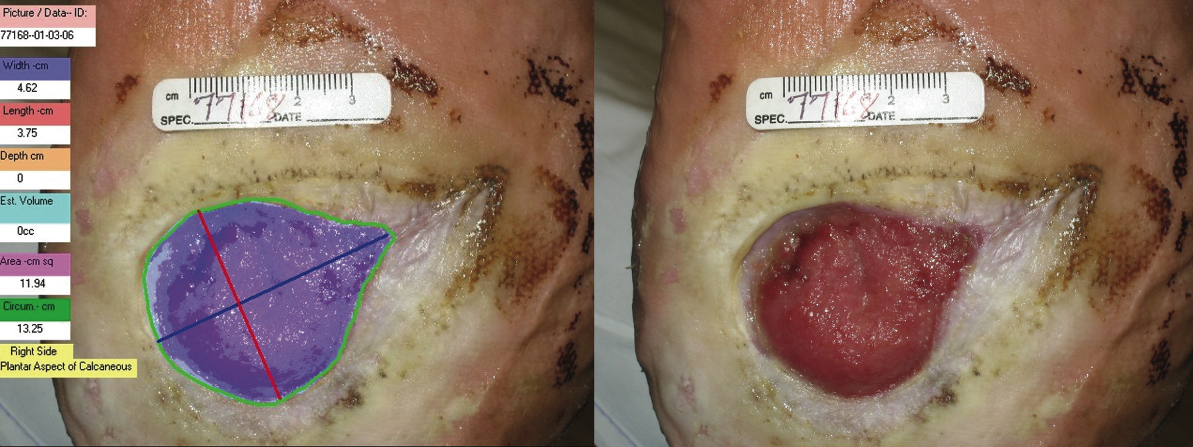 There are a number of methods for determining wound dimensions. The most popular method is simple linear measurements (length x width). When taking these measurements, one should note the widest width and the longest length perpendicular to the width line. One would then calculate the area by multiplying width by length. Unfortunately, this is the least accurate method as this measurement is based on a rectangle while wounds are a variety of shapes. Errors can exceed 50 percent using this method. A second method is tracing the wound on a transparent acetate sheet. This is a better approach (with a +/- 20 percent error rate) but it is not without problems. Steam forms below the film surface, glare blocks visibility of the wound and there is an increased risk of wound contamination when performing tracings. Tracing also may be painful and this method takes time to count the squares (in cm) after placing the acetate sheet over a grid to determine wound area. It is well documented that the inter-rater reliability of wound tracings (two people tracing the same wound) yields large differences in wound areas. A recent advancement in wound tracings provides for a digital tablet that counts the number of squares in centimeters. However, a second tracing over the original tracing on the device is necessary and this increases the risk of error. Digital photo planimetry software provides for the mapping of wounds on a computer using a mouse, notebook tablet with pen or USB tablet with pen. Planimetry captures images of wounds without regard to distance. However, getting as close as possible provides better images and measurements. The image has a ruler in the picture and one can use this for easy calibration. Once it is calibrated, the computer generates measurement data, captures it and adds it to the image for easy reading. One may save the data to Excel® to calculate the percent change in the area of the wound in addition to providing a wound history and/or statistical analysis of changes in the wound parameters. Those who use this software can generate reports for referrals or to send to insurance companies and Medicare for reimbursement purposes. Best of all and unlike with tracings, others may verify the data because the original picture is always available for review. PictZar has been shown to have intra-rater reliability of 98.3 percent or less than a 1.7 percent error rate. Photo digital planimetry has a few limitations. One limitation is that the clinician must take the photograph perpendicular to the wound. A manuscript detailing PictZar digital planimetry software and comparing intra- and inter-rater reliability to traditional tracings has been submitted to a peer- reviewed journal.