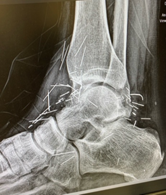 A 41-year-old male with no chronic medical conditions presented with recurrent 9/10 left ankle pain and numbness. The patient had acupuncture about 10 years prior from an unlicensed provider in which the needles were broken and left in the body, leading to numerous ramifications. Most significantly one such needle migrated, leading to a pneumothorax that required emergent surgical intervention. The patient stated he is a retail worker and would like his pain addressed due to its impact on his activities. He stated he had tried over-the-counter and prescription pain medications and muscle relaxers. He did have previous surgery for removal of foreign bodies in his left knee. His left lower extremity was previously assessed without any surgical intervention.