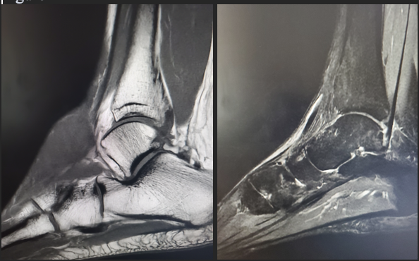 Magnetic resonance imaging (MRI) of the left foot and ankle indicated the presence of a heterogeneously enhancing cystic and solid mass positioned anterior to the talus and navicular bones. The mass, measuring approximately 3.7 x 2.3 x 2.8 cm, exhibited an ill-defined boundary and showed no osseous involvement (Figure 1). The radiologist performing the initial read included hemangioma in the differential diagnosis.