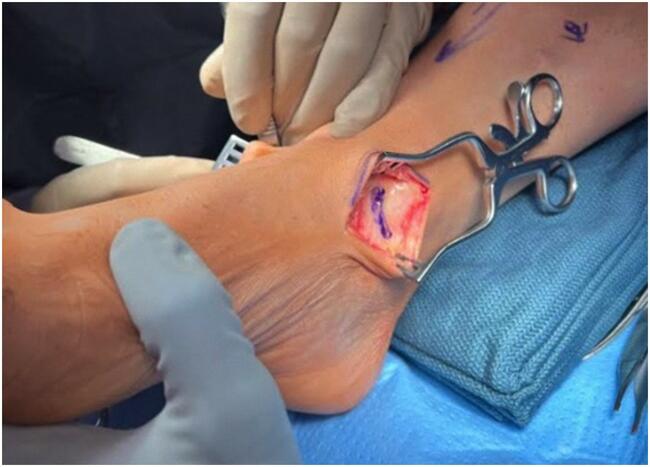 Typically, the allograft measures near 5.0mm, and reaming it done to 5.5mm followed by placement of a Bio-Tenodesis screw (Arthrex) (Figure 2). Then, we placed a Bio-Tenodesis screw with close to 20mm of the allograft tendon buried into the medial malleolar canal (Figure 2). Before moving on to the next stage of the repair, a standard linear incision measuring 4cm allows dissection of the lateral ankle to obtain access to the distal fibula and lateral talus. Care is taken during dissection to avoid the intermediate dorsal cutaneous nerve. After identifying the ATFL, careful dissection through vertical transection of that ligament and the ankle capsule is next, just off the ATFL attachments along the fibula. Careful periosteal dissection carried down through the fibula will reveal its anterior ridge.