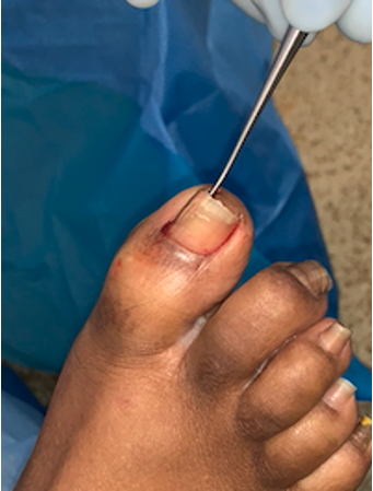 Surgical matrixectomy has proven to be successful in removal of ingrown nails, for which many techniques have been published in the medical literature. Some of the more popular surgical techniques that have been previously described include Winograd, Frost, Modified Frost, Zadik, and Kaplin.8 These techniques typically incorporate some type of skin wedge resection or complete avulsion of the nail. Some of these techniques require significant removal of skin, potentially leading to increased chance of pain and/or infection. Presented here is author Dr. Morgan Jerabek’s (MJ) preferred surgical matrixectomy technique, which she finds successful and reproducible with minimal skin incision and soft tissue trauma.