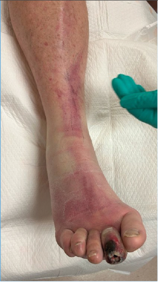 We present the case of a 64-year-old male patient with past medical history of type 2 diabetes mellitus with peripheral neuropathy, peripheral vascular disease, chronic kidney disease, and prior contralateral Charcot neuroarthropathy. The patient presented to the emergency department with a necrotic, dusky right second digit, ascending cellulitis of the right anterior leg, abscesses in multiple right foot compartments, and a wound to his distal right second toe which had appeared within the week prior. His regular podiatrist in the community recommended and performed an incision and drainage of that digit and started the patient on oral antibiotics. At his postoperative follow-up appointment 2 days later, the community surgeon recommended he go directly to the VA emergency department with the expectation of amputation.