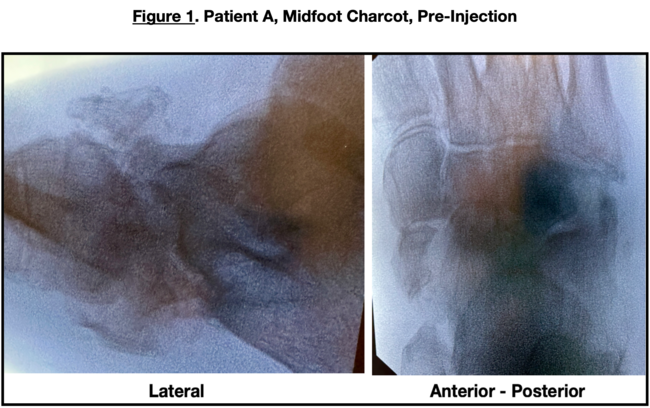 The following 3 cases present scenarios of placental tissue injection into acute neuroarthropathic joints. All 3 patients had a history of diabetes with elevated HbA1c levels. In addition, these patients all underwent immobilization in a cast boot for at least 6 weeks before the injection. None of these patients had ulcerations or infectious processes. All acute areas of Charcot neuroarthropathy resolved.