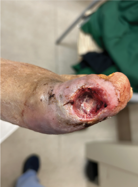 Physical examination demonstrated nonpalpable pedal pulses and complete loss of protective sensation. There was no gross deformity of the foot besides pes planus, and the patient ambulated without ambulatory aids. Notably, the patient was awaiting kidney transplant, contingent on healing of his foot ulceration. The patient reported no pain from the ulceration, likely due to peripheral neuropathy. The ulcer measured 2.7 cm x 2.0cm x 0.7cm with exposed bone and deep tissues. No tunneling, undermining, or sinus tract was present. There was purulent drainage, malodor, periwound calor, erythema, and edema, however. The wound bed was a mix of fibrotic and granular tissue.