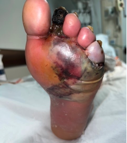 A 74-year-old male presented to the emergency room with wet gangrene of his left foot. The patient had an extensive past medical history including frontotemporal dementia, congestive heart failure, hypertension, hyperlipidemia, diabetes, chronic kidney disease, chronic atrial fibrillation, severe pulmonary hypertension, and poor compliance with his medications and care. He was seen initially by his primary care physician (PCP), who had prescribed intravenous vancomycin and ceftriaxone. The patient's PCP was the primary source of past medical history due to the patient’s mental status (awake, alert and oriented score of 1).
