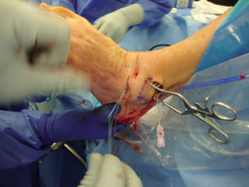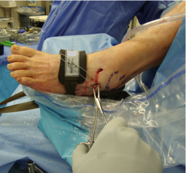 Then advance the nitinol wire and use it to capture one strand from the suture anchor, pulling the wire back through the skin, exiting in the sinus tarsi region. Then perform the same procedure to capture the other strand of the suture from the anchor. This occurs approximately 1 cm anterior and superior to site one of the first strand, advancing the lasso percutaneous in the same aforementioned manner and exiting the anterolateral portal. We then pull back strand two from the suture anchor through the skin exiting site two.