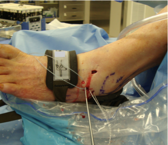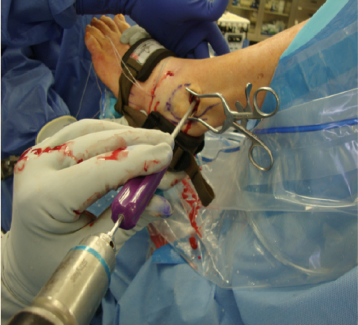 After ensuring supine positioning of the patient and the administration of a popliteal nerve block and general anesthesia, we place a well-padded thigh tourniquet on the patient, and position a thigh holder to elevate the foot a few inches off the operating table. Then we outline the distal fibula, peroneal tendons and intermediate dorsal cutaneous nerves with a surgical marker. We then apply a noninvasive ankle distractor and use manual traction to distract the ankle.