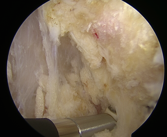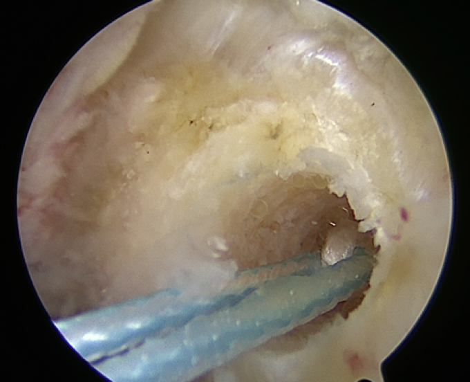 Establish standard anteromedial and anterolateral portals, and perform extensive arthroscopic debridement using a 4 mm camera and shaver. We are then able to address any intra-articular pathology at the time of arthroscopy before proceeding to the lateral ankle stabilization. Then direct attention toward the anterolateral gutter, carrying out extensive debridement in order to remove any synovitis or bone spurs, which may result in impingement. Debridement of the distal fibula to bone entails using ablation to facilitate debridement of capsular and ligamentous adhesions. Then obtain lateral stabilization of the ankle joint with one of two constructs.