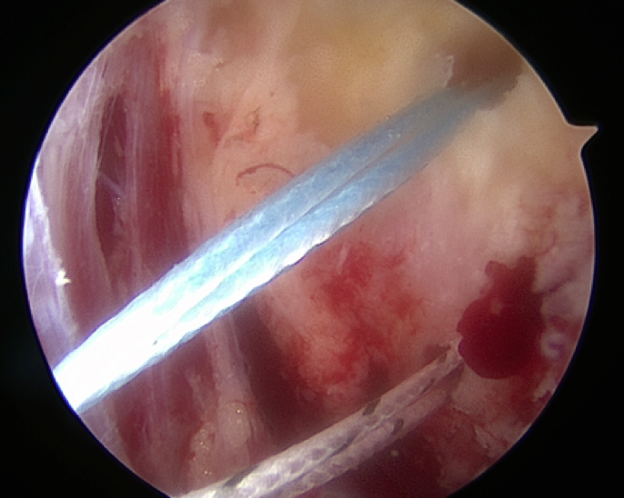 Then remove the drill guide and the sutures should now be visible exiting the anterolateral portal. We then use a Micro SutureLasso (Arthrex) to capture the anterior talofibular ligament, ankle capsule and inferior extensor retinaculum. We place the Micro SutureLasso percutaneously in the sinus tarsi region and angle it toward the anterolateral portal, placing the first pass approximately 1.5 cm to 2 cm inferior and anterior to the distal fibula.