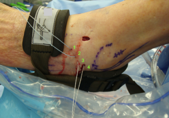 same technique, we insert a second bone anchor in the fibula at the level of the lateral talar dome. The strands exit the anterolateral portal and one would again use a Micro SutureLasso to capture the individual strand approximately 1 cm anterior and superior to the previous strand for site three as well as site four. Four individual strands are now exiting the skin. We then proceed to make an accessory portal between sites two and three. Use a blade to incise only the skin.