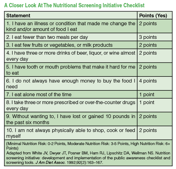 According to a study produced by Wissing and colleagues, patients who live by themselves (common in our elderly patients) are often malnourished as they may eat fewer meals or foods of lesser nutritional value.1 Clinicians may evaluate the nutrition of patients and their level of isolation through a series of standardized questionnaires (see “A Closer Look At The Nutritional Screening Initiative Checklist” at left and “A Guide To The Simplified Nutritional Appetite Questionnaire” below at right), or by interviewing patients as a part of the initial history taking. Clinicians play an influential role in nutrition intervention when a patient is susceptible to malnutrition, a condition that encompasses poor food selection or inappropriate caloric intake.1