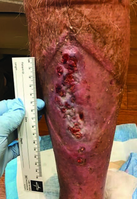 An 86-year-old male with type 2 diabetes presented to the office for evaluation and management of open ulcerations to his left anterior leg. The patient noted scraping the front of the leg on a bicycle pedal roughly one year prior with progressive enlargement of the original small wound (see first photo above). He also noted a 10- year history of purple discoloration with tight, friable skin and mild edema to the left leg only. Previous care from an outside wound healing center included serial debridement, collagenase SANTYL (Smith and Nephew), compression dressings and other modalities.