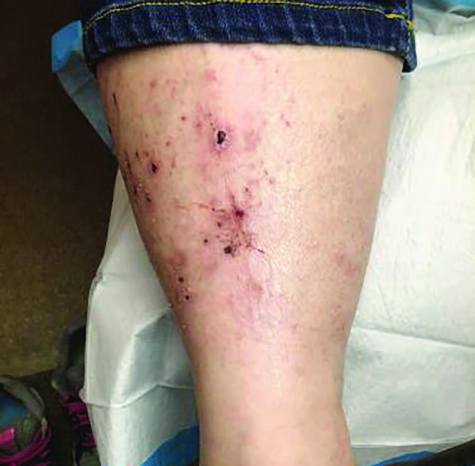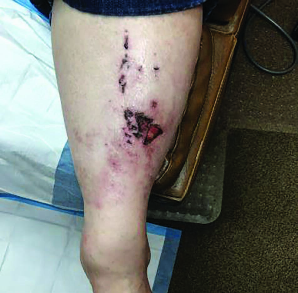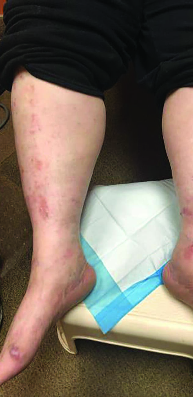 The underlying catalyst in lichen simplex chronicus does seem to have a psychological basis in most cases. In our patient’s case, this was most likely undiagnosed anxiety, evident on subjective evaluation. Curing the acute presentation of lichen simplex chronicus is fairly straightforward, but addressing the underlying etiology can be a bit challenging. In hindsight, a referral to behavioral medicine would have been beneficial to the patient. As a podiatric dermatology Fellow in Northeastern Pennsylvania, presenting cases of lichen simplex chronicus were fairly common, but I have not seen many cases in my career since. At first glance, one could easily diagnose this case as venous stasis dermatitis, due to the presence of edema and venous stasis-like changes. The excoriations on her arm and the obvious, anxious personality trait aided in making the correct diagnosis.