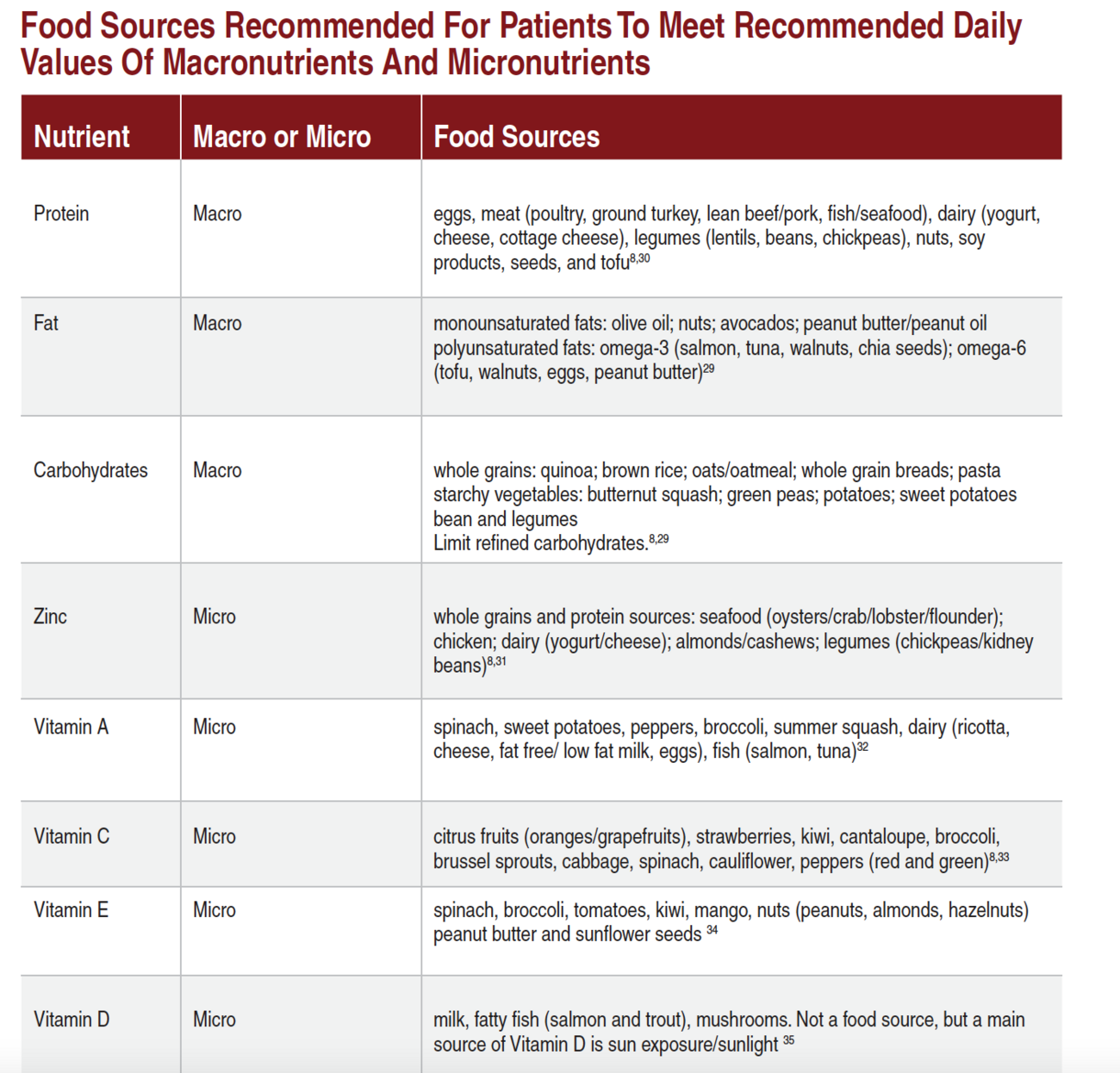 Since macronutrients and micronutrients can positively impact wound healing, enteral nutritional supplements exist to promote this process. Moore and Williams and their respective teams showed that the benefits of nutritional supplementation, such as significantly increasing collagen accumulation in wounds of elderly patients, typically arise within two weeks.10,27 Given the established positive effects of macronutrients and micronutrients on wound healing and general tolerability of nutritional supplementation among patients, it may prove beneficial to add this practice to a DFU care plan. As seen in the table above, many food sources overlap and can fulfill daily requirements for different macro and micronutrients.
