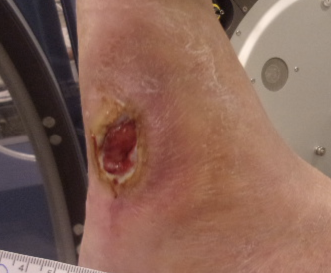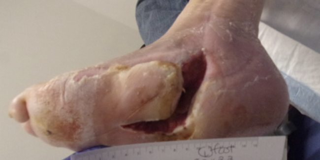 Case 2. Patient 2 is a 60-year-old male admitted for a diabetic foot infection. He underwent extensive debridement and continued to have purulence and malodor, requiring additional surgical intervention. After the infection was well controlled, NPWT was applied at the standard -125mmHg with a wound area of 73cm2 (see fourth photo above). Upon examination at the second week, the wound area increased to 75.5cm2, and we increased the NPWT pressure was increased to -150mmHg. After doing so, the wound area decreased substantially to 60cm2. After a 55 percent decrease in wound area, we stopped NPWT and the patient continues to heal without complication (see fifth and sixth photos above).