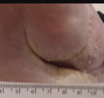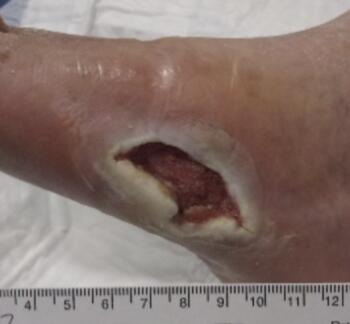 Case 3. Patient 3 is a 69-year-old male who presented with a chronic, infected fifth metatarsal wound. Surgical and clinical debridements resulted in minimal wound changes, and NPWT at -125mmHg was initiated. The wound area at this time was 15cm2 (see seventh photo above). After two weeks of NPWT, we increased the pressure to -175mmHg. This resulted in a significant reduction in wound area to 11.4cm2 after one week of increased pressure (24 percent area decrease, see eighth photo). NPWT continued until the wound bed was level with the periwound skin level. This patient continues to heal without complication.