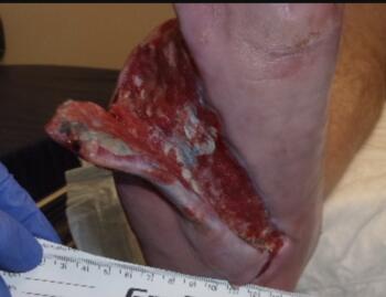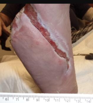 Case 1. This patient is a 60-year-old male who presented to the emergency department with foot and leg pain, swelling and systemic symptoms of infection. He subsequently underwent emergent extensive incision and drainage for necrotizing fasciitis. After clearing all infection from the wound, he began NPWT with an initial setting of -150mmHg. After one week of NPWT at -150mmHg settings, the wound area measured 60.7cm2 (see first photo above). At this time, we increased pressure to -175mmHg. After one week of increased pressure, the area of the wound decreased to 58.5cm2 (see second photo above). The NPWT continued until achieving substantial granulation tissue. The wound went on to heal (see third photo above) with NPWT, collagen and antibiotic dressings.