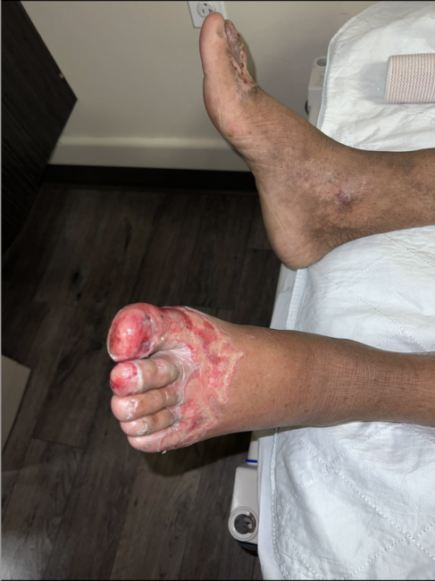 A 65-year-old male with diabetes and a past medical history significant for peripheral neuropathy, coronary artery disease, hypertension, and benign prostatic hypertrophy presented for admission to an ABA-verified burn center with second- and third-degree hot oil scald burns to his left foot. He had burned 1% of the total body surface area on his left foot (Figure 1). There were partial- and full-thickness injuries.