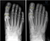 As with any osteotomy, the Akin osteotomy can also be subject to overcorrection. An overcorrected Akin does not produce a hallux varus per se. Rather, it produces a toe with an adducted tip. The hallux toenail will generally dictate an overcorrection and one often identifies it intraoperatively, although it can become more pronounced postoperatively. It is best to address overcorrection sooner than later. As the Akin osteotomy tends to be a closing wedge procedure, correcting the overcorrection often involves adding bone graft to create an opening wedge. If the surgeon identifies this during the index operation, he or she can replace the initial bone from the wedge or a portion of it back into the osteotomy. In the subacute stage, before the osteotomy has healed, one can still add bone graft but the source is either cadaveric or autogenous. Healed malunions require a new osteotomy and, depending on the clinical scenario, can be a medial opening wedge or lateral closing wedge. The fixation for revision Akin procedures depends on the correction that the surgeon is trying to achieve and whether one has added bone graft. In my experience, plate fixation occurs most often for the revision Akin because there is previous hardware that one is removing and this limits the availability for new hardware. Of course, the specific clinical scenario dictates the hardware choice. Locking plates may provide additional stability and a “T” or “L” plate configuration can fit a variety of osteotomies.