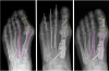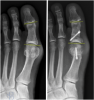 Theoretically, the surgeon would determine the location of where to perform the Akin procedure by identifying where the level of deformity is located within the proximal phalanx. Accomplish this by drawing a line bisecting the medullary shaft and compare that to a line that is perpendicular to the joint line of the articular side of the phalanx. The three options are: proximal, midshaft or distal. In the rare exception of a severe intrinsic deformity of the hallux at the distal or proximal side, it is my experience that a midshaft oblique osteotomy that extends into a metaphysis is the best method of correction. In most cases, the osteotomy is an adjunct to the bunion correction so theoretically, extreme degrees of deformity correction are not necessary and center of rotation of angulation (CORA) corrections of such a small bone are unnecessary in clinical practice. Most commonly, surgeons will perform wedge osteotomies of the proximal phalanx of the hallux with a lateral hinge. The benefits of the hinge are to act a single point of fixation when one combines this with another fixation source (i.e., screw, wire, staple). Through and through osteotomies can be beneficial to “dial” in the correction when the surgeon performs these in the transverse plane. Intraoperative fluoroscopy is extremely helpful to assess that the first MPJ and the hallux interphalangeal joints are parallel.