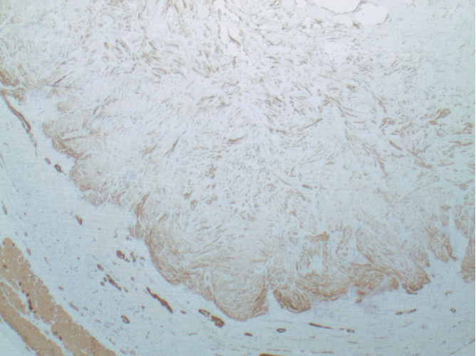 Angioleiomyomas are benign soft tissue tumors arising from the smooth muscle layer, or tunica media, of blood vessels. These rare tumors present as painful nodules in the face and extremities, most commonly affecting women between 30 and 50 years old. Although this uncommon subcutaneous and encapsulated soft tissue mass most often occurs in the extremities, there are several documented cases found in the viscera; such as the uterus, bladder, lung, and gastrointestinal tract.1,3