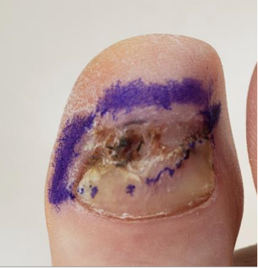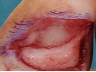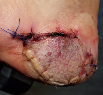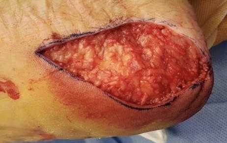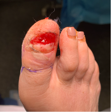 Two months later she presented with a similar presentation. This time, we biopsied the lesion and sent it to pathology, which diagnosed amelanotic melanoma. Before performing any radical amputation, we would first attempt a wide excision of the lesion (see second photo). The patient then went to the operating room for an excisional biopsy (see third photo). The area was covered with a biologic dressing while awaiting pathology results (see fourth photo).