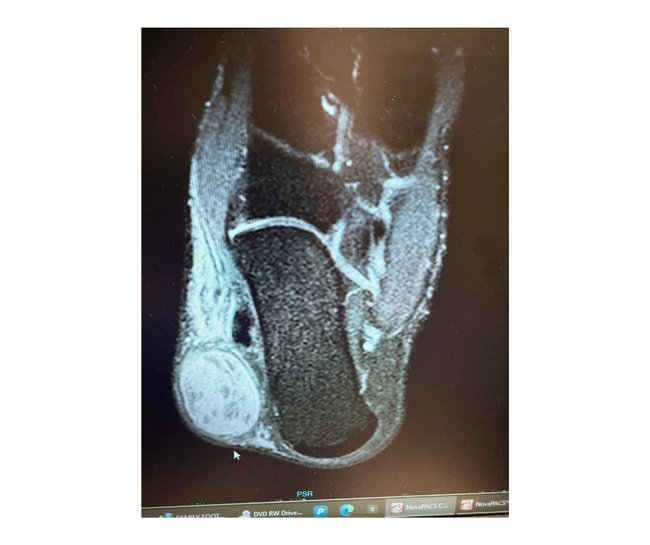 A plain film X-ray of the right foot revealed no significant findings. Subsequent magnetic resonance imaging (MRI) with and without contrast showed a 4.0 x 3.0 x 2.4 cm heterogenous enhancing mass. The MRI interpretation also noted multiple nonenhancing internal components to the mass, a few of which demonstrated an intrinsic hyperintense signal on T1-weighted images.