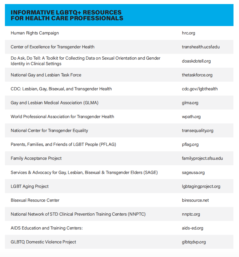 Establishing partnerships with community health centers or hosting educational programs to raise awareness about services are other examples. This conveys you care enough to be informed about the community’s specific needs. See the table on page 45 for a brief list of informative resources health care providers can consult for more information regarding the LGBTQ+ community.