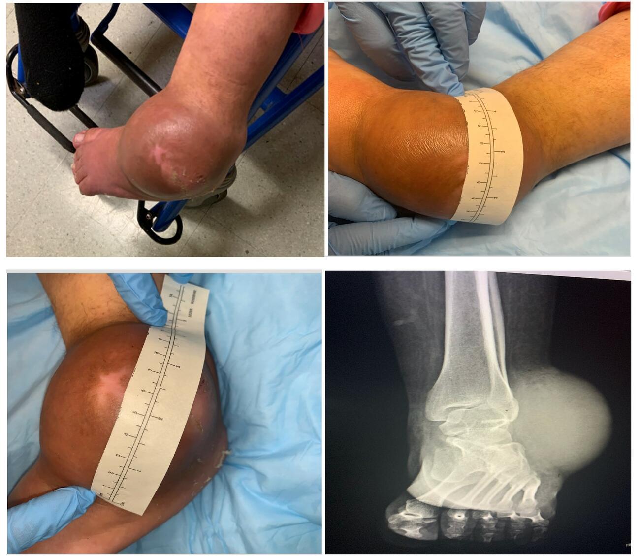 A physical exam of the left ankle demonstrated a large, fluctuant soft tissue mass adjacent to the lateral malleolus (see first photo above). The area exhibited focal edema and erythema with a notable sinus tract and purulent drainage. Initial attempts at obtaining an IV and blood work proved difficult due to the patient’s excitability and lack of cooperation. The patient quickly became agitated when staff approached with medications or to discuss the treatment plan. The staff allowed the patient time to acclimate and familiarize herself with the room before additional attempts. Once obtained, labs and vitals revealed tachycardia along with leukocytosis, lactic acidosis, and elevated erythrocyte sedimentation rate (ESR) and C-reactive protein (CRP). The team decided to take the patient to the operating room for an urgent incision and drainage with ankle wound exploration.