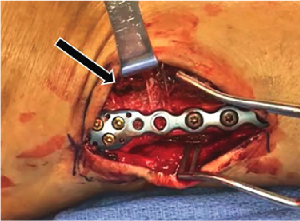 To obviate the potential for the persistence of further instability in the sagittal plane, surgeons may elect to either place two suture buttons or directly repair the AITFL. It can often be challenging to place two suture buttons due to the location of the fibular fracture or lag screw, if previously inserted. To avoid violating another drill hole through the fracture site or weakening the bone around the lag screw, direct augmentation of the AITFL continues to grow in popularity. The surgeon can loop suture material through the lateral fibular hardware, inserting it into the Chaput tubercle of the distal lateral aspect of the tibia, securing it with a PEEK or bio-composite screw (see photo to left). This construct will directly stabilize the interosseous component of the syndesmosis and the AITFL, resulting in a multi-ligament augmentation.