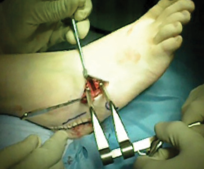 A bone distractor placed across the osteotomy allows for the placement of the bone graft (click here for photo). The surgeon then inserts an 8-10 mm bone wedge allograft with the apex medial and base lateral into the osteotomy site until it is flush with the lateral wall (click here for photo). The osteotomy can be fixated with a Kirschner wire, staple, or buttress plate. A rasp or rotary burr can smooth the edges of the graft. Prior to closure, the surgeon confirms final position and hardware via fluoroscopy. The extensor digitorum brevis muscle repair takes place using 3-0 Vicryl suture, as does deep closure. Skin closure is achieved using 3-0 polypropylene suture.
