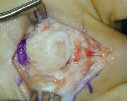 Metatarsal head resurfacing (HemiCAP, Arthrosurface) can serve as an excellent option in cases of avascular necrosis with minimal bone shortening. The Morris taper design allows for excellent bone apposition and also results in a solid fixation with immediate range of motion potential. If there is extensive bone loss and a low demand situation, we have found an arthroplasty with a tendon graft space technique to be an excellent option. We will typically place a peroneal tendon allograft in the resection site and then pierce it with a retrograded K-wire from the tip of the toe into the MPJ. We then spin the tendon into a ball filling the empty joint space before advancing a Kirschner wire into the metatarsal. We have found this technique an effective method for limiting shortening at the resection site.